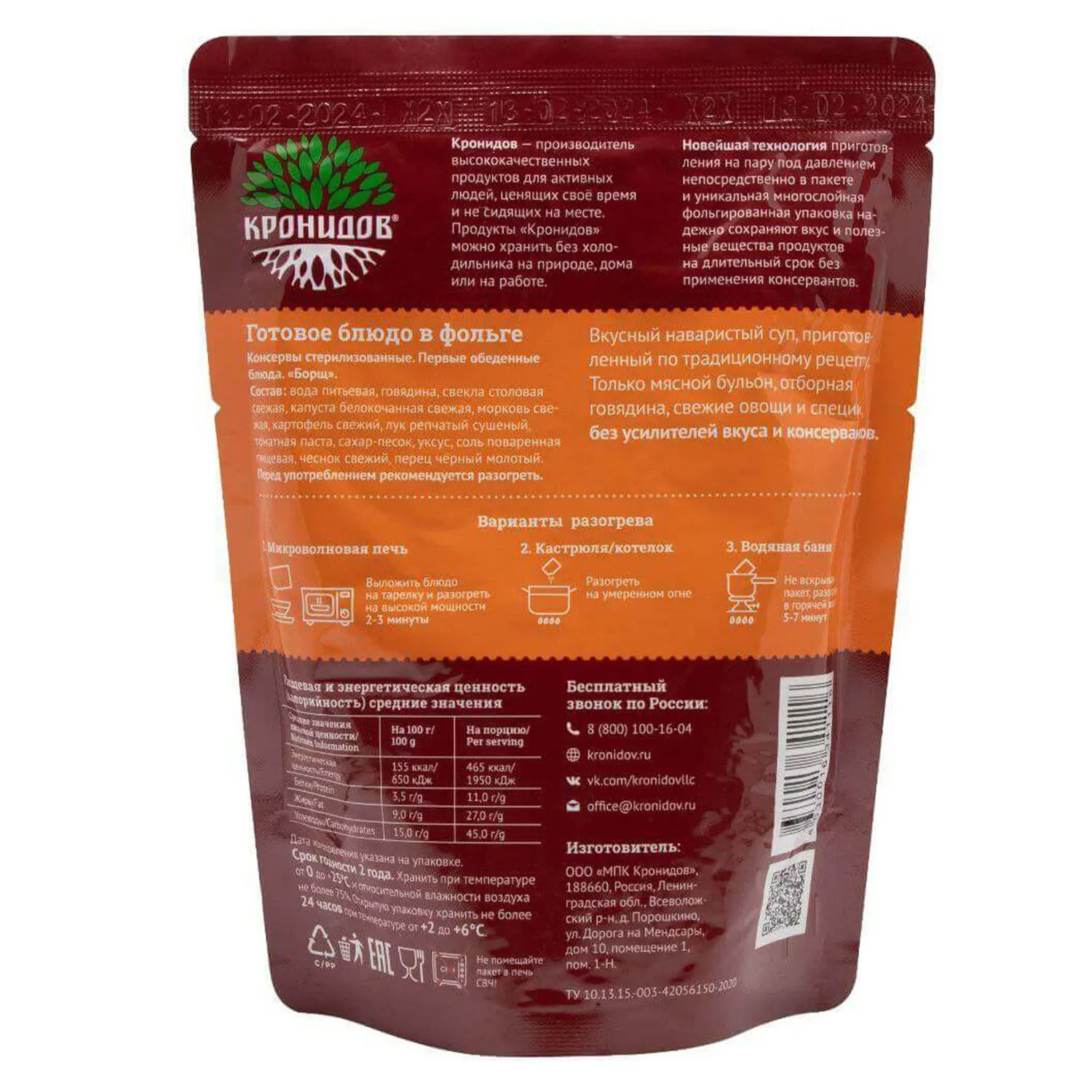 Состав: Бульон мясной, говядина, свекла столовая свежая, капуста белокачанная свежая, морковь свежая, картофель свежий, лук репчатый сушеный, томат-паста, сахар-песок, уксус, соль поваренная пищевая, чеснок свежий, специи, лавровый лист