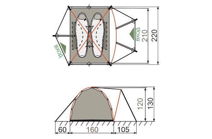 Размеры внутренней палатки (ДхШхВ): 210х160х120 см