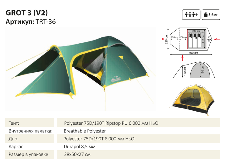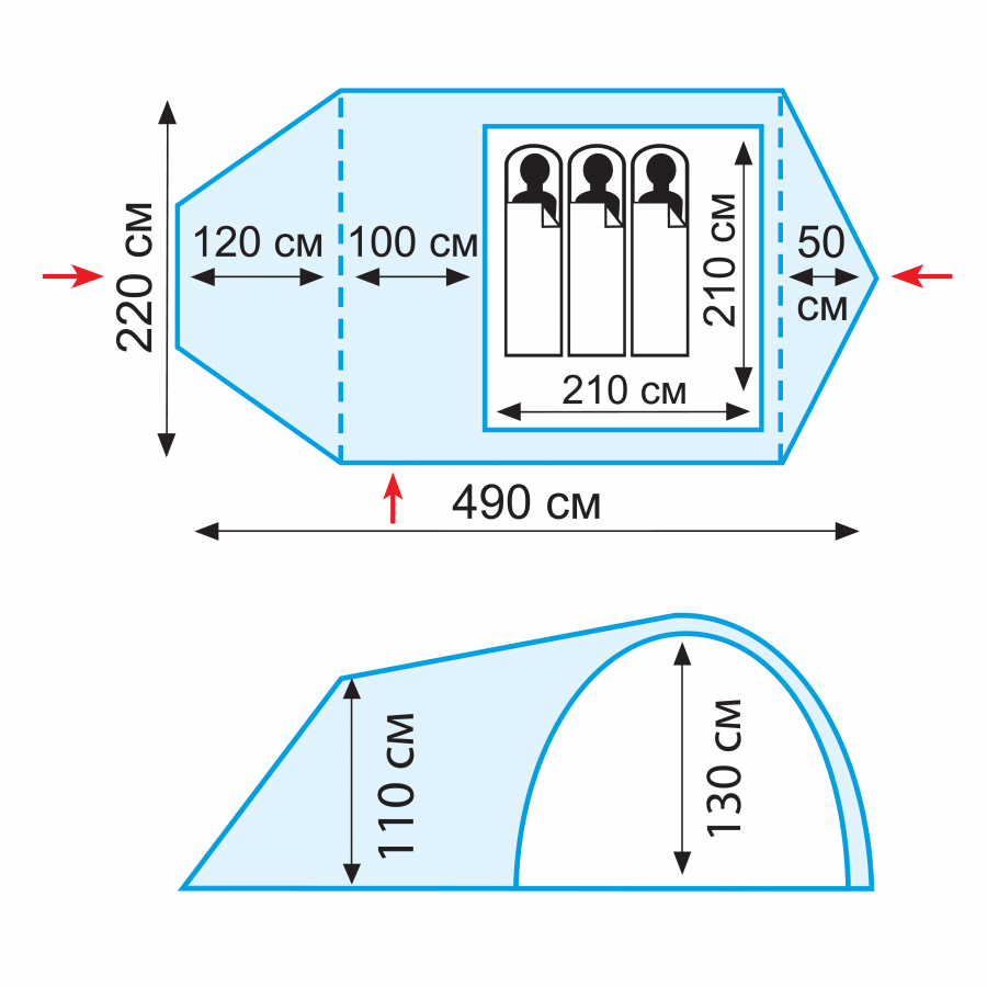 Размер внутренней палатки ДхШхВ, см 210 х 210 х 130