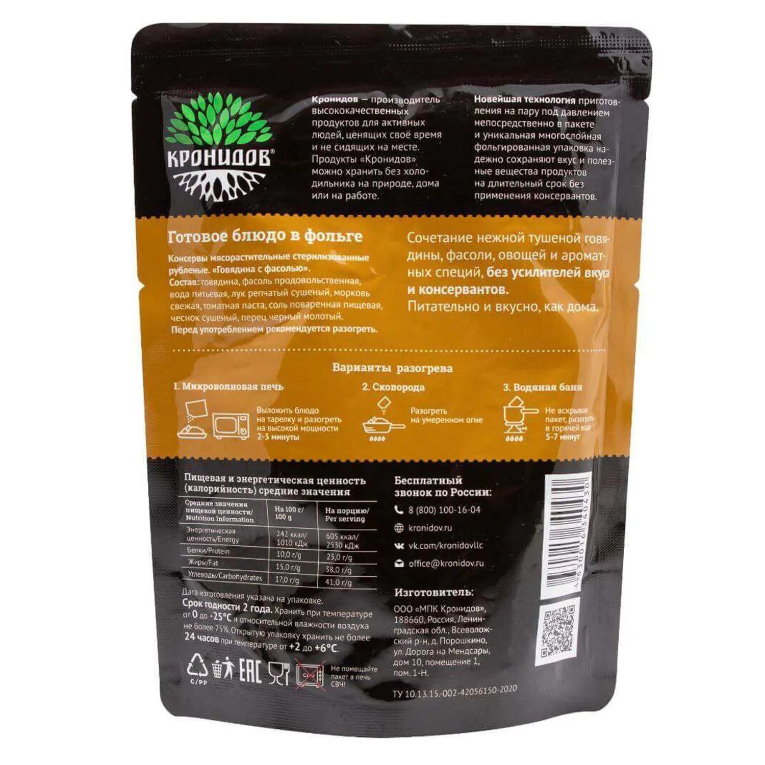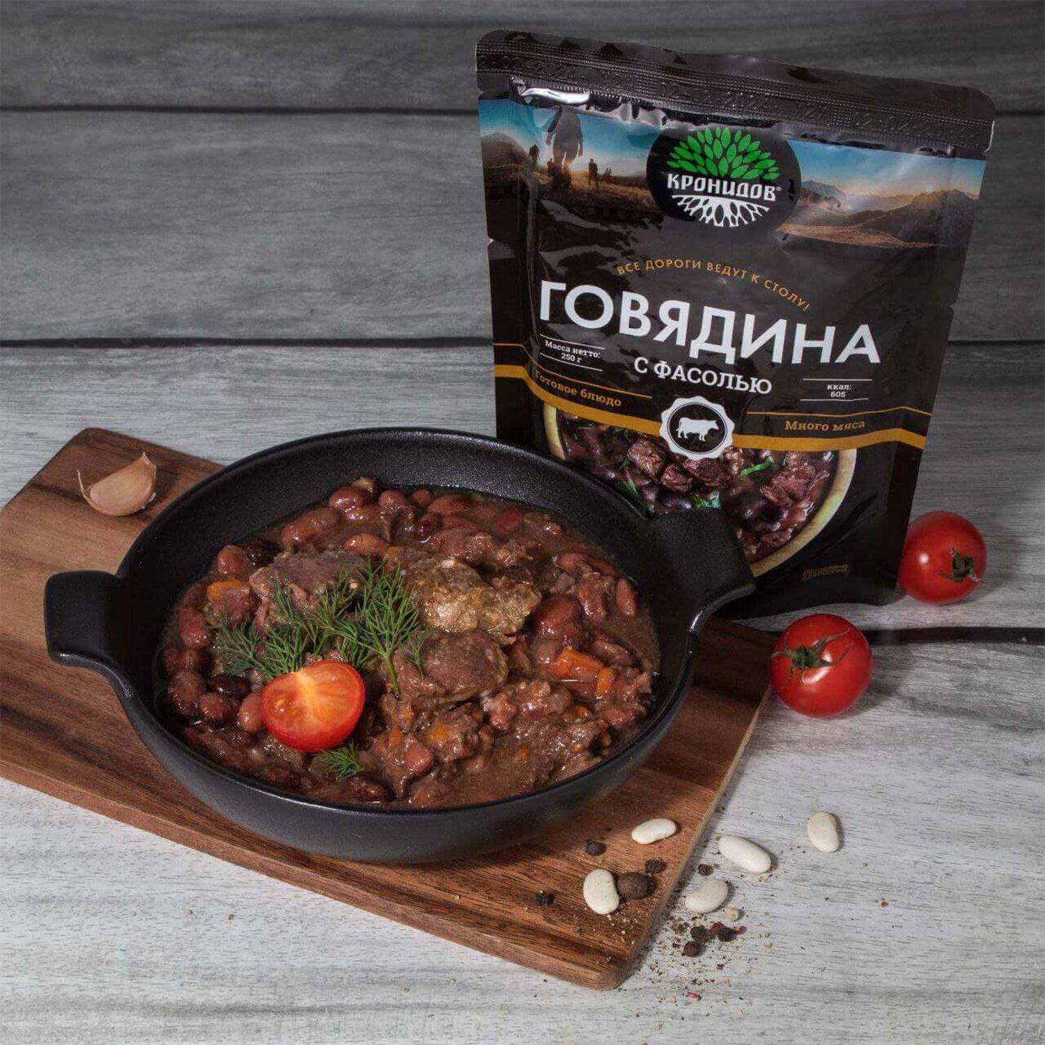 Говядина (не менее 30%), фасоль продовольственная, вода питьевая, лук репчатый сушеный, морковь свежая, паста томатная, соль поваренная пищевая, чеснок сушеный, перец черный молотый