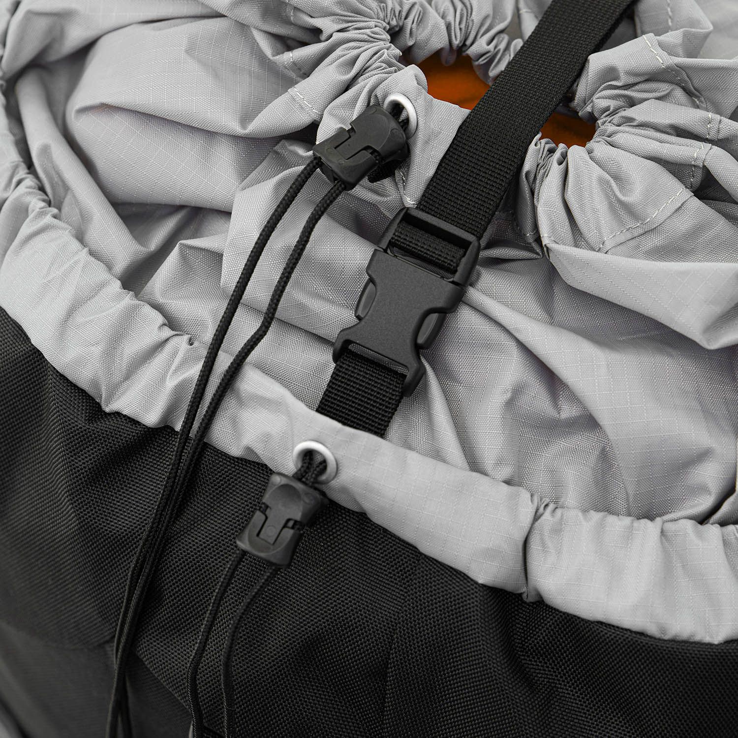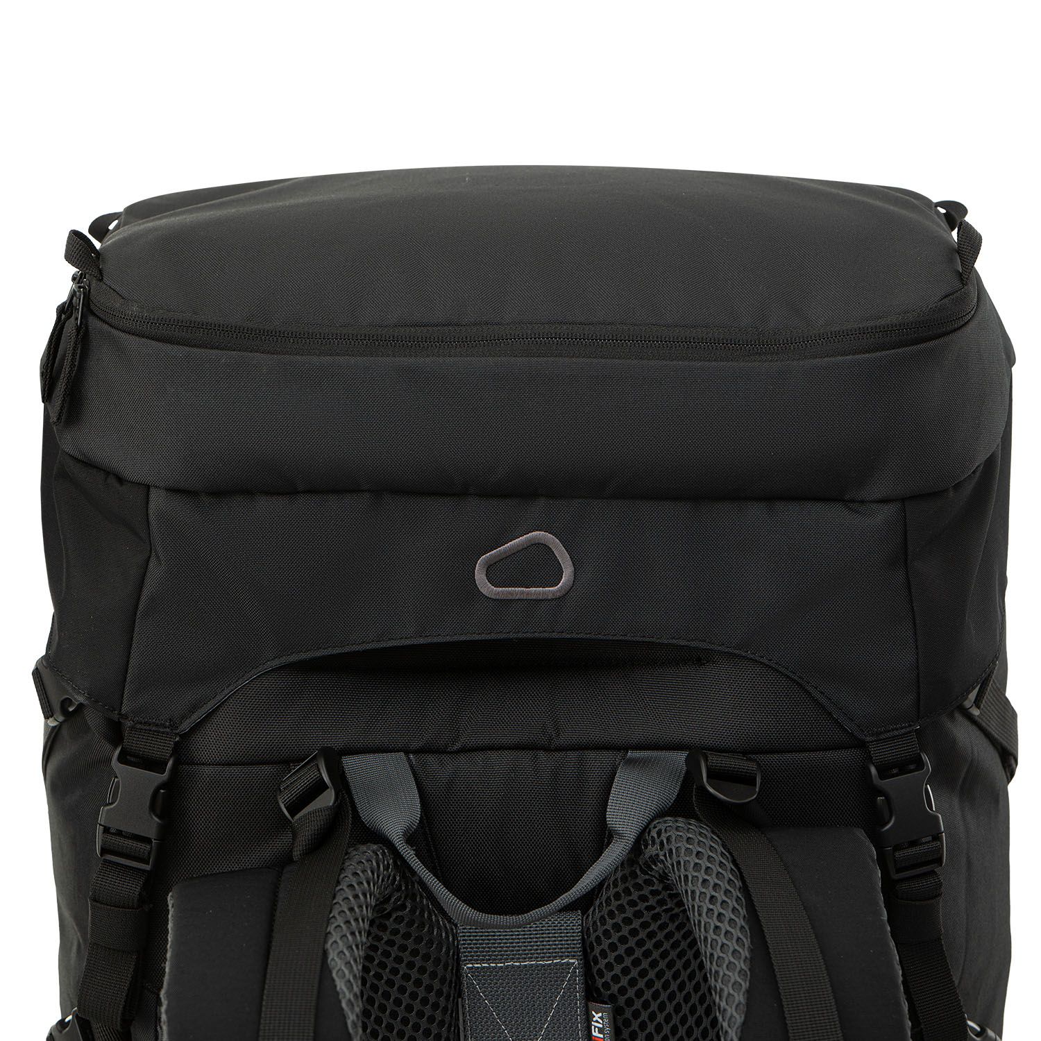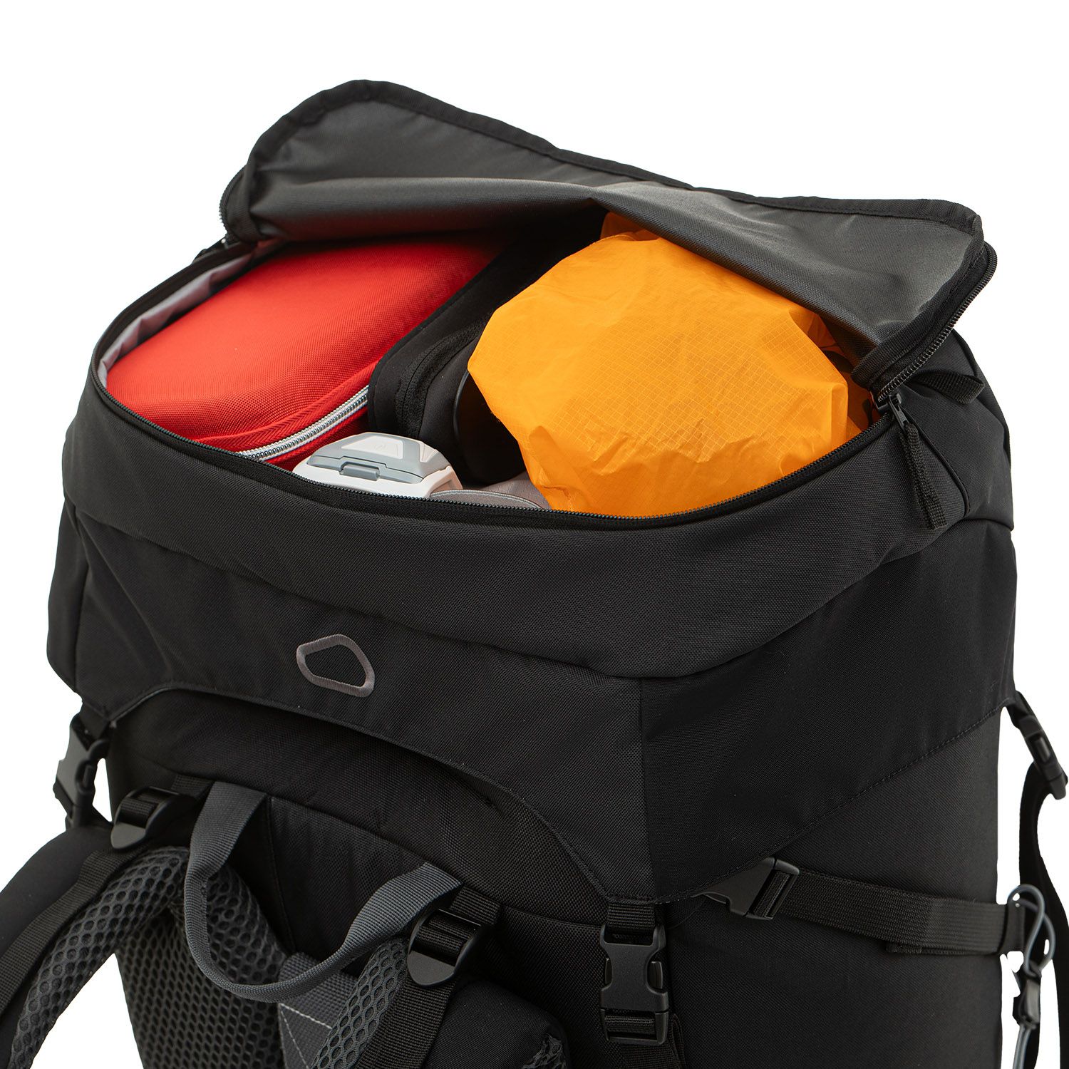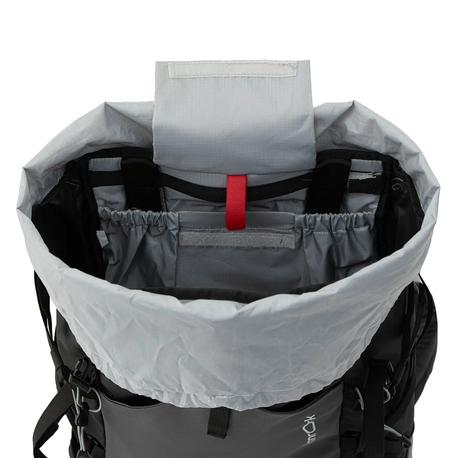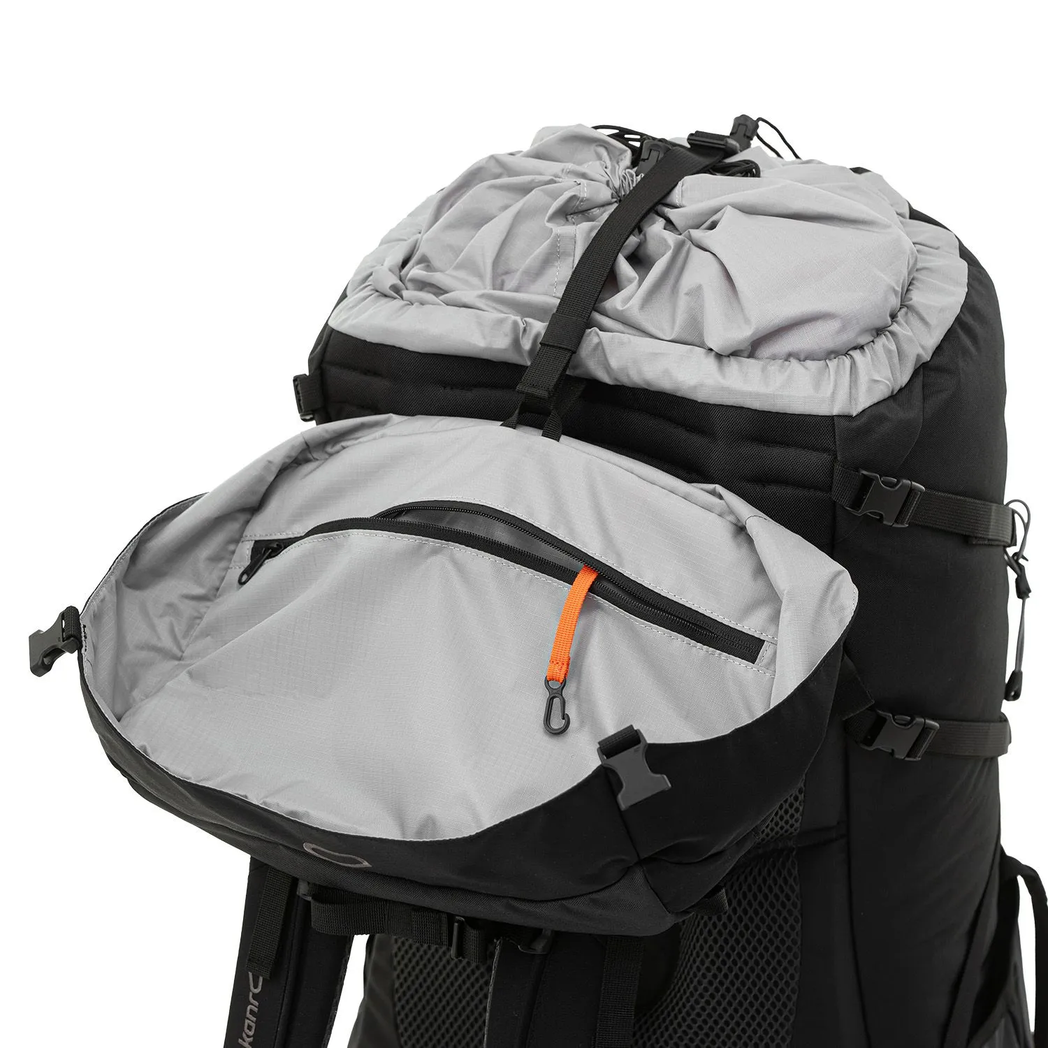 К верхней части рюкзака пришит тубус с утяжкой, а клапан сделан «плавающим», то есть регулируется стропами по высоте. Вместе они позволяют увеличить объём основного отделения на 15 литров. Также под клапаном можно разместить дополнительное снаряжение — например, тент или бухту верёвки.