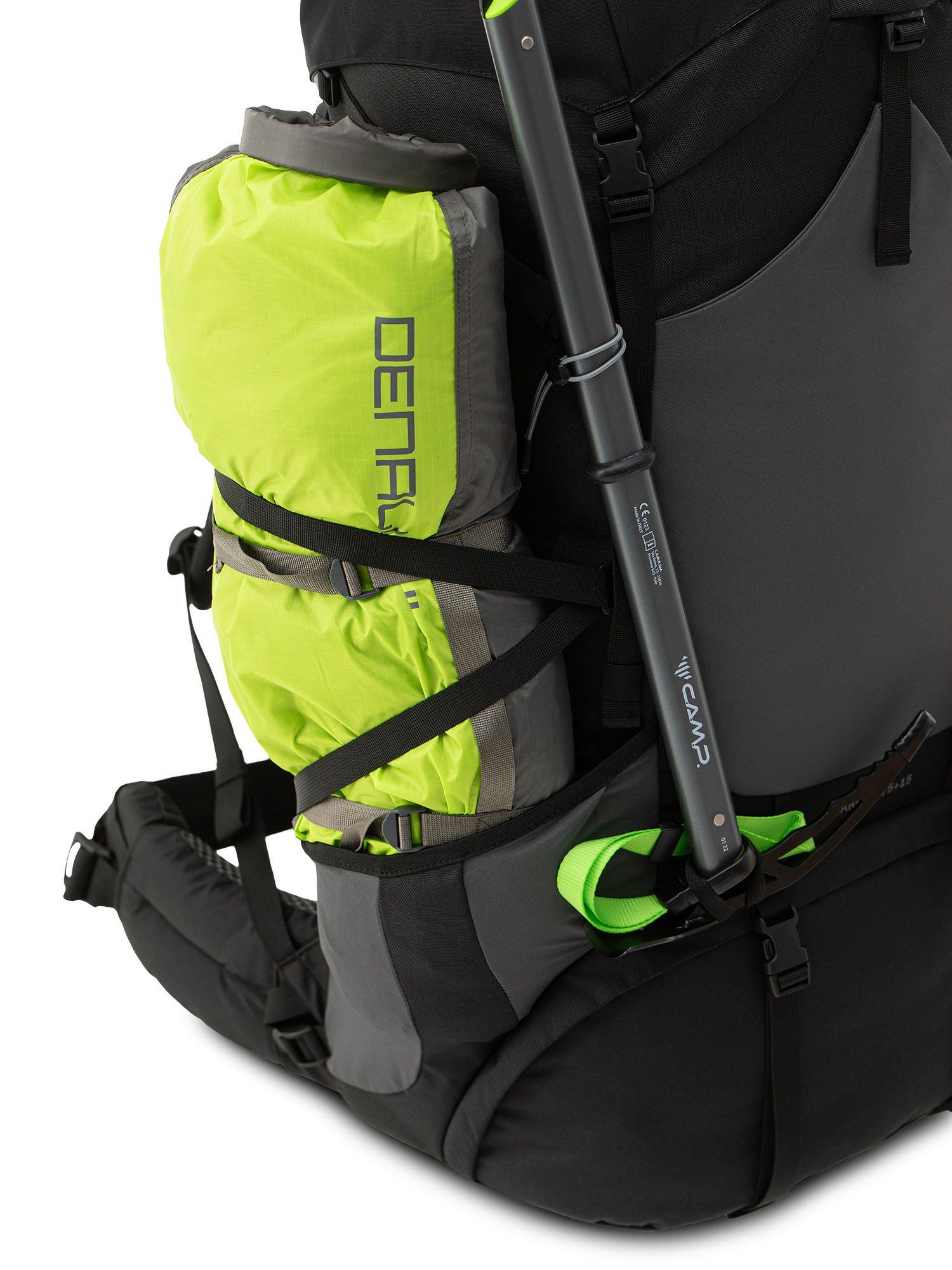 На фасаде рюкзака предусмотрены крепления для треккинговых палок и ледоруба.