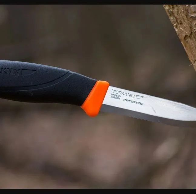 Модель Morakniv Companion F Serrated, как следует из названия, оснащена клинком с серрейторной заточкой, позволяющей перерезать канаты, веревки и другие многослойные материалы. Форма клинка, использованная в модели – drop-point. Общая длина ножа составляет 218 мм, при этом на лезвие приходится 103 мм, а толщина в обухе составляет 2.5 мм.